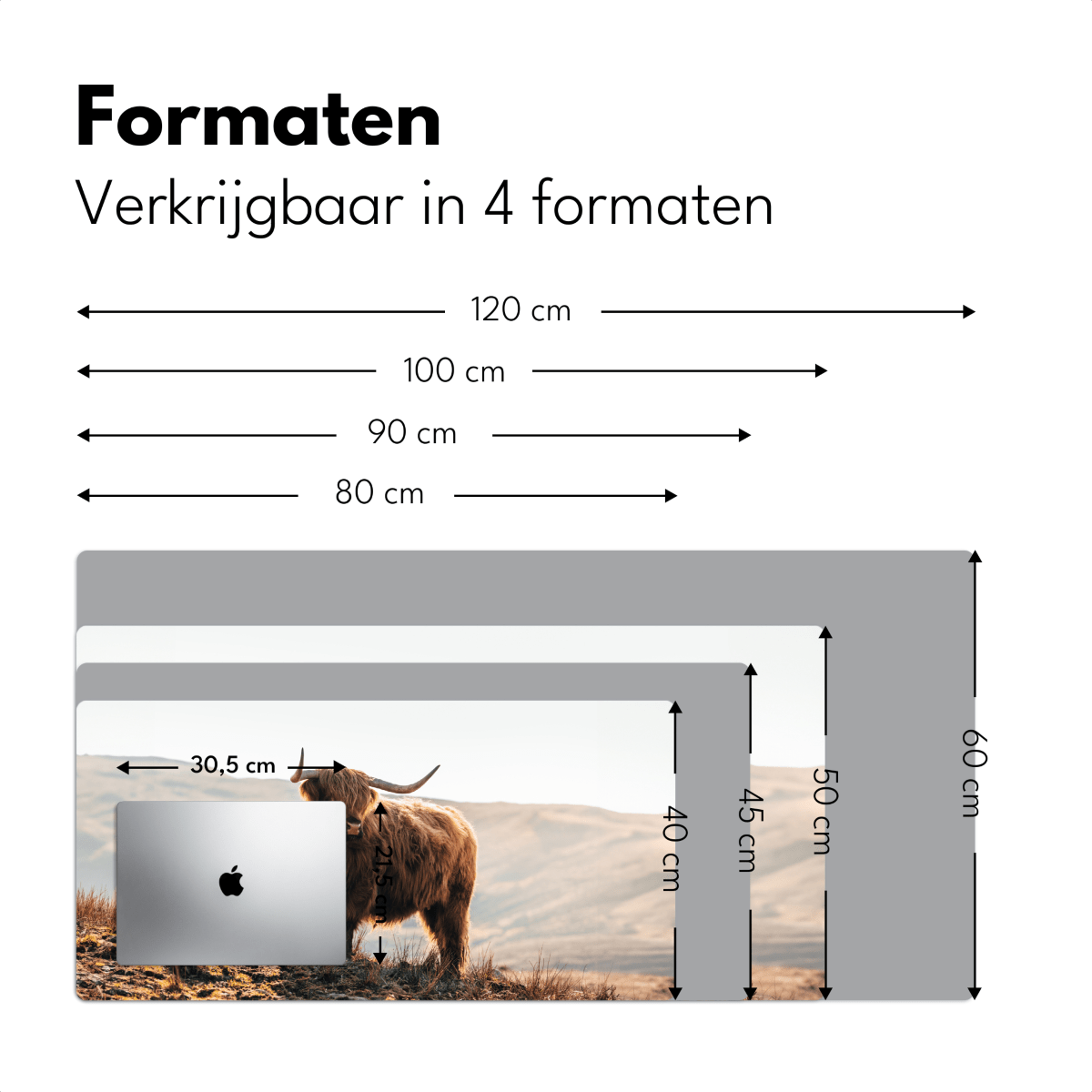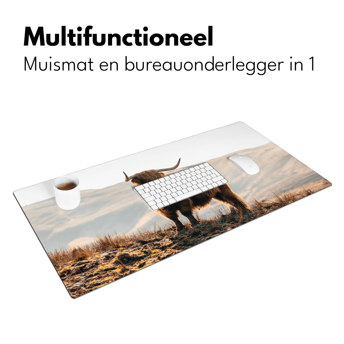 Transformeer je werkplek met deze bureau onderlegger Schotse Hooglander natuur en breng de rust en kracht van de Schotse Hooglanders direct naar je bureau. Het ontwerp toont een majestueus exemplaar in zijn natuurlijke omgeving met uitgestrekte groene heuvels en een serene achtergrond die een gevoel van vrijheid en kracht oproept. Deze onderlegger combineert functionaliteit met kunstzinnige uitstraling en biedt niet alleen bescherming voor je bureau tegen krassen, morsen en dagelijkse slijtage, maar inspireert ook elke dag tot focus, productiviteit en verbinding met de natuur. Perfect voor thuiswerkers, studenten en iedereen die zijn werkplek wil verrijken met een vleugje natuurlijke schoonheid en dierenkracht.Bureau onderlegger Schotse Hooglander natuur - Stijlvol én praktisch