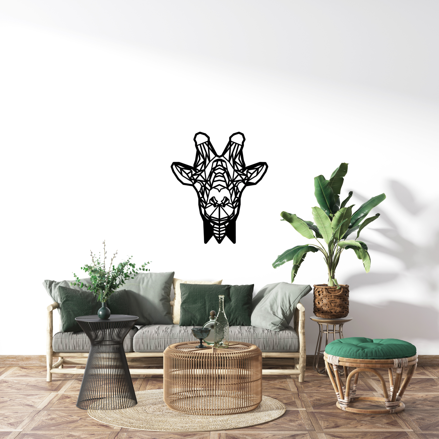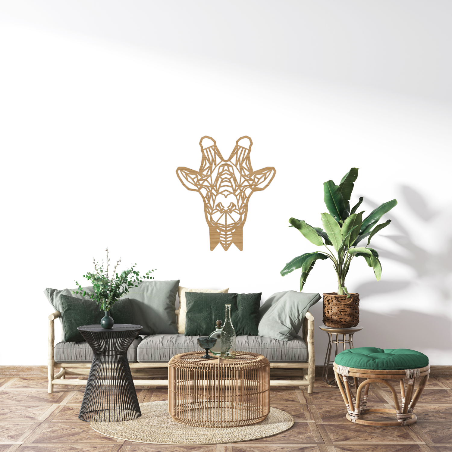 Klein (S) 30 x 26 cm, Middel (M) 45 x 39 cm, Groot (L) 60 x 52 cm – passend voor elk type muur of ruimte.5. Kan ik de Geometrische Houten Giraffe Kop combineren met andere muurdecoratie?