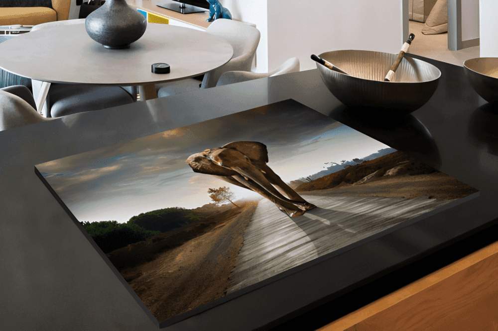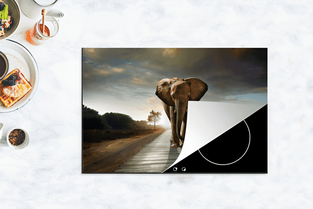 Breng kracht en elegantie in je keuken met deze unieke inductiebeschermer met olifantmotief. Het ontwerp toont een indrukwekkende olifant die statig over een rustige weg loopt, omringd door natuurlijke tinten die rust en balans uitstralen. Deze beschermmat combineert functionaliteit met een prachtige visuele uitstraling, waardoor hij niet alleen je inductiekookplaat beschermt, maar ook een sfeervol accent toevoegt aan je keukeninterieur.