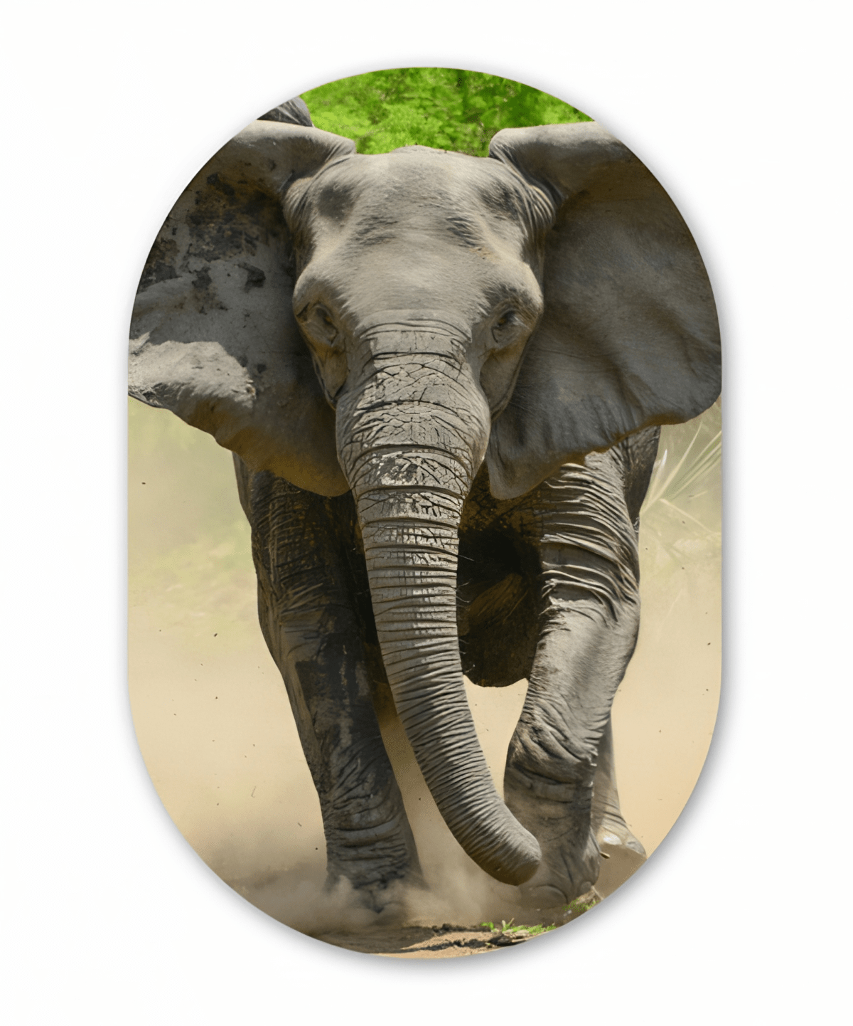 Een jonge olifant rent in volle vaart over de weg en probeert zijn kudde bij te houden.