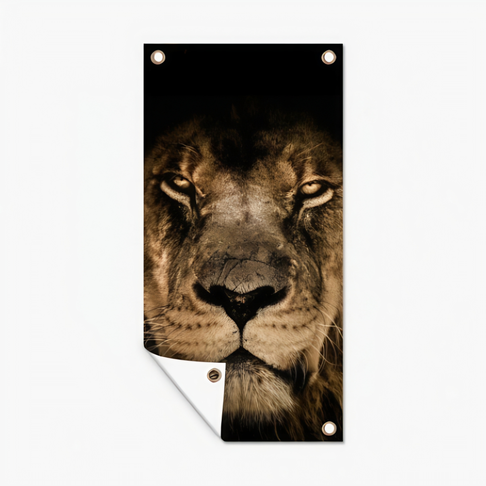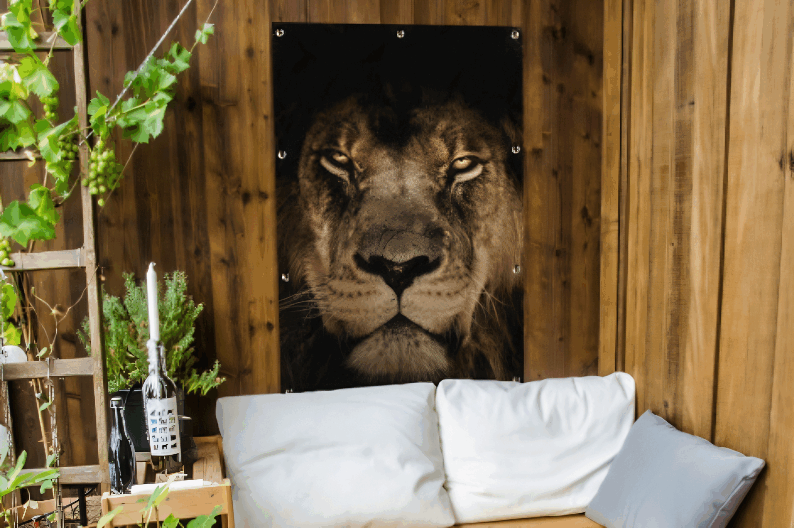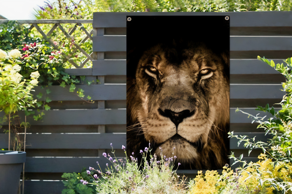 Portret van een Leeuw tegen een zwarte achtergrond.