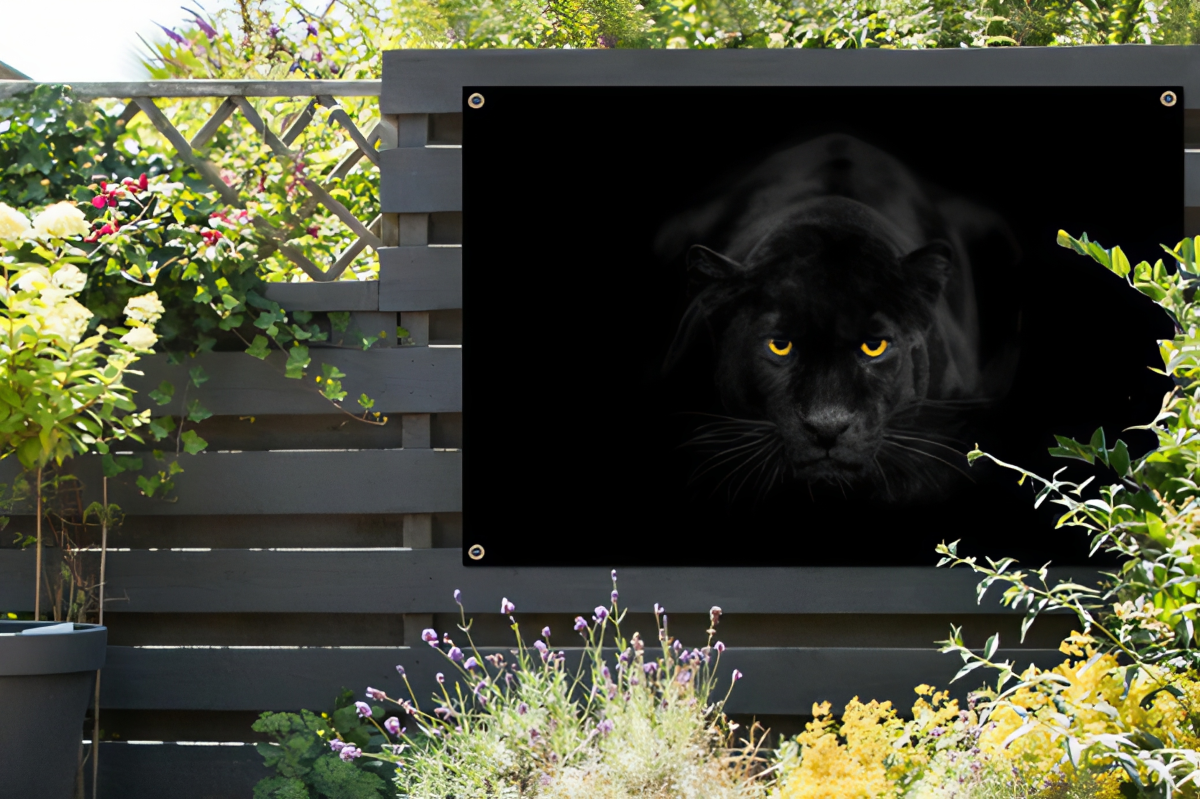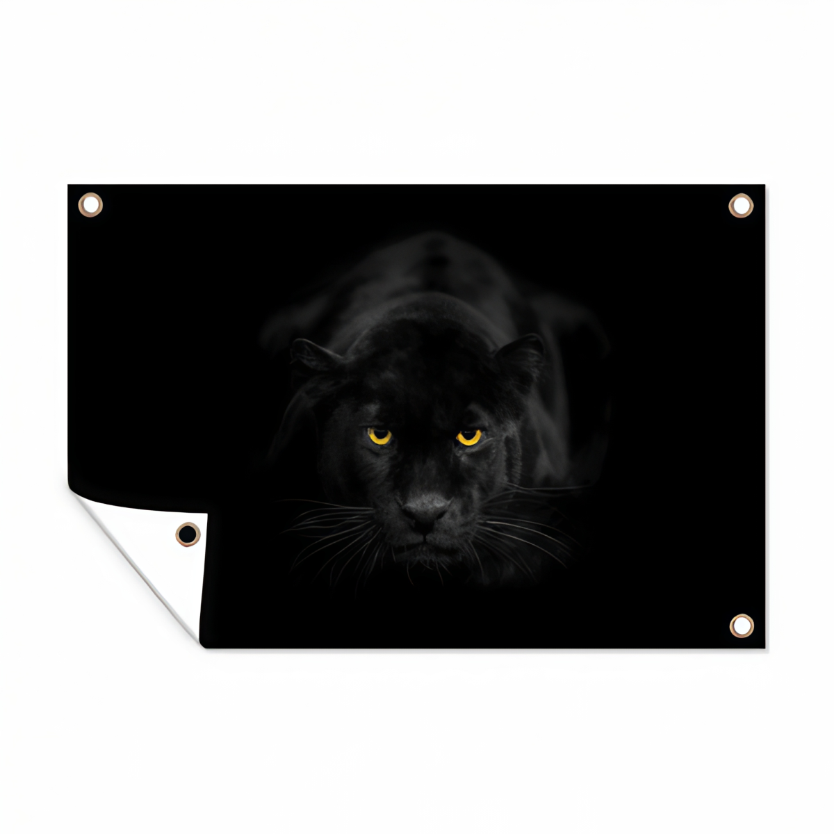 Een zwarte panter met opvallende ogen op een zwarte achtergrond.